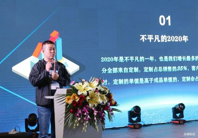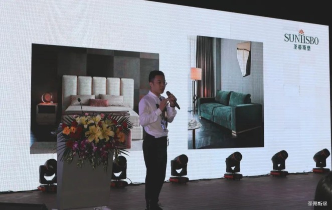 华灯璀璨的开场仪式,点燃了现场如火如荼的气氛。公海555000jcjc集团集团营销总经理陈玉伟先生对晚会进行了主题发言,他对2020年的营销工作进行了总结,并着重从营销工作部署、重点项目开展、产品整合、拎包帮扶、渠道运营和移动+定制整装优势等方面对2021年的营销工作做了全面的统筹规划。同时,他还讲解了“美国梦凯莎床垫”新品的产品工艺、市场优势、产品定位,使经销商对我们的新产品拥有更深入的认识和了解。